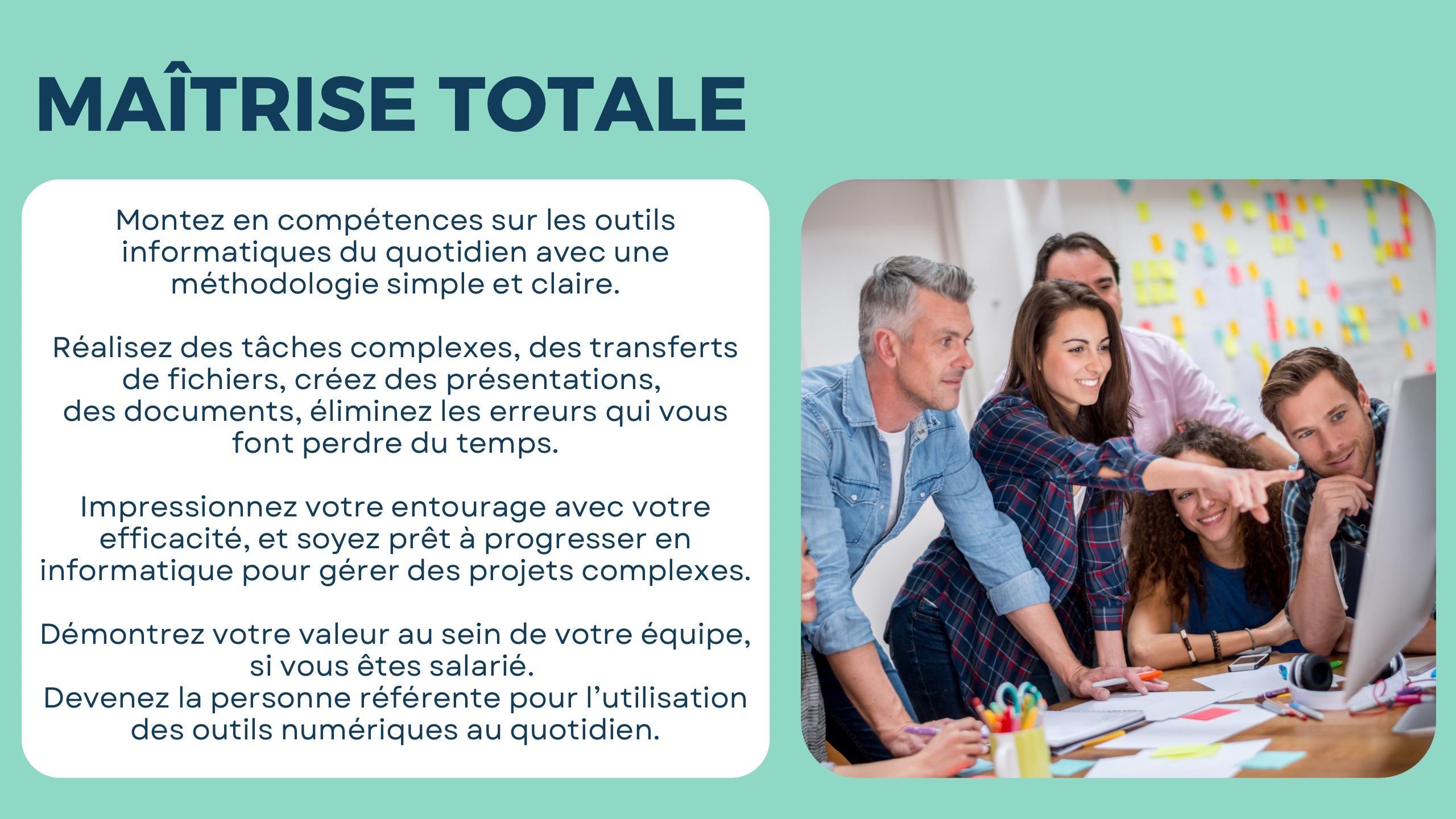 Cette formation de 45h s’adresse à toute personne souhaitant maîtriser son environnement numérique, développer ses compétences du numérique.